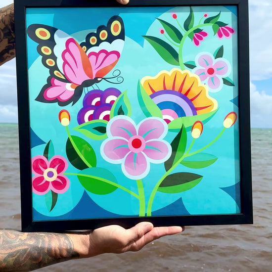 Butterfly Garden brings a burst of color and calm through the playful style of Alex Yanes. A bright butterfly hovers over bold, layered florals set against a vibrant blue background, creating a piece that feels alive and full of movement.
