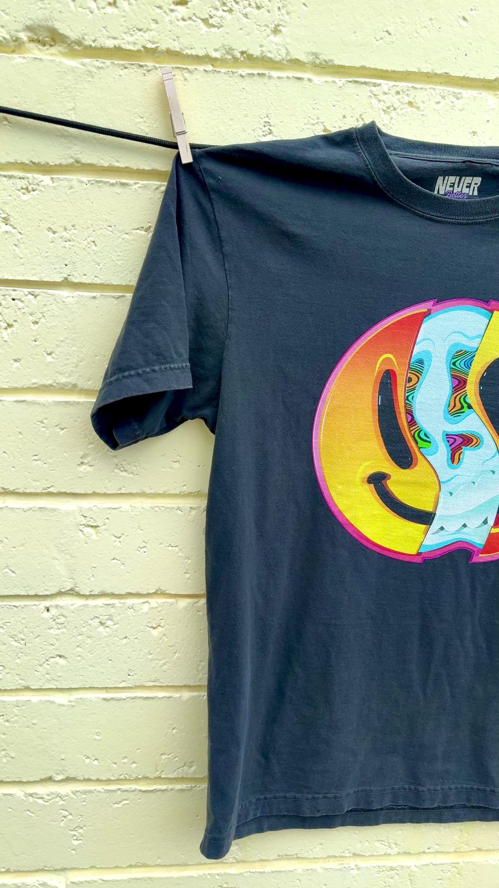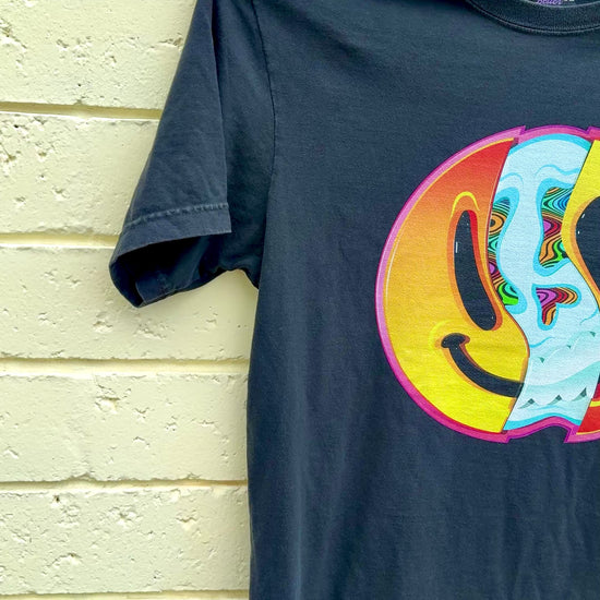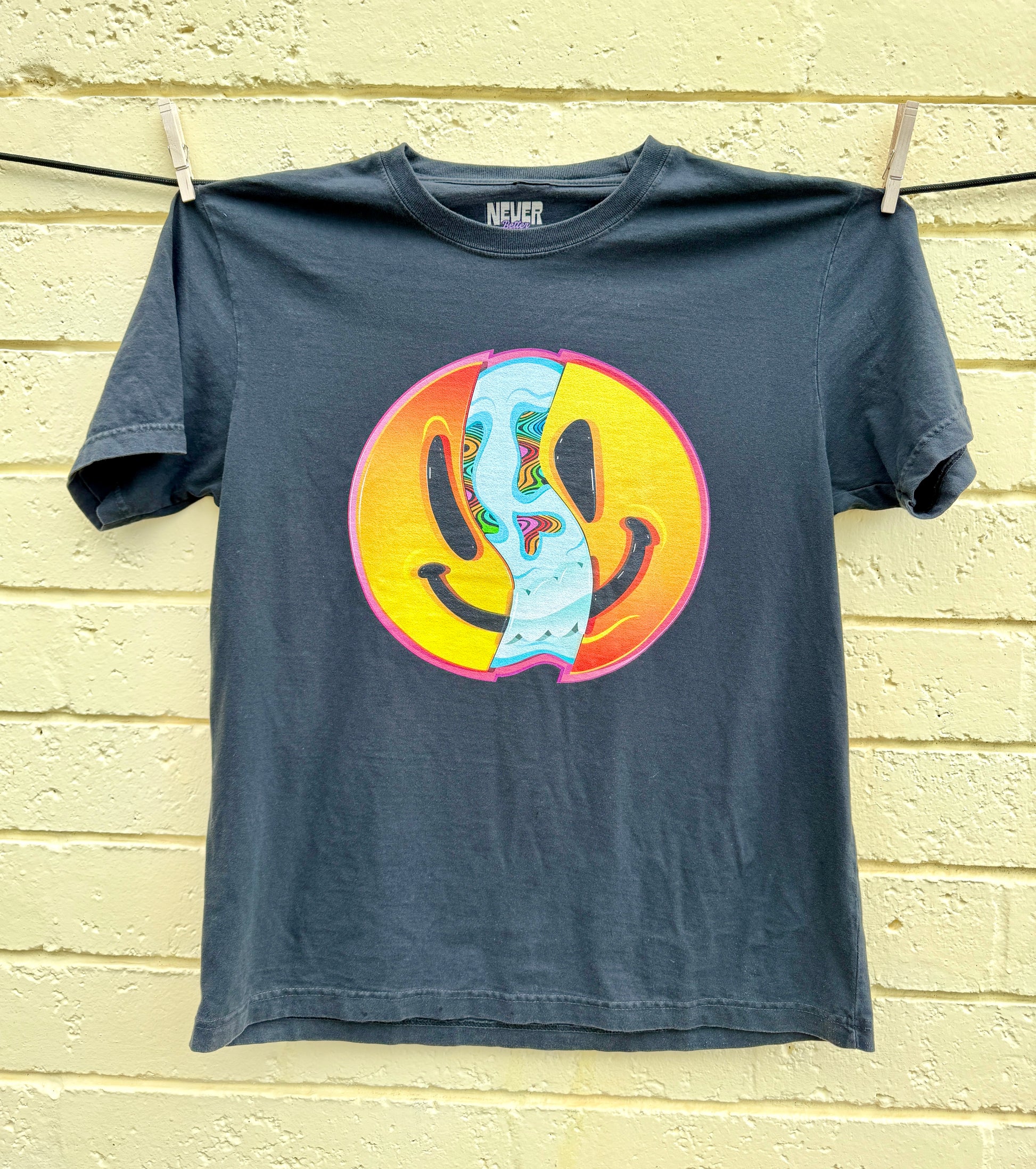 The Happy Twist T-Shirt brings a classic smiley face to life with a colorful split design by Alex Yanes. Bright yellows meet wavy, psychedelic patterns down the middle, giving the graphic a playful edge while keeping the fit clean and simple.